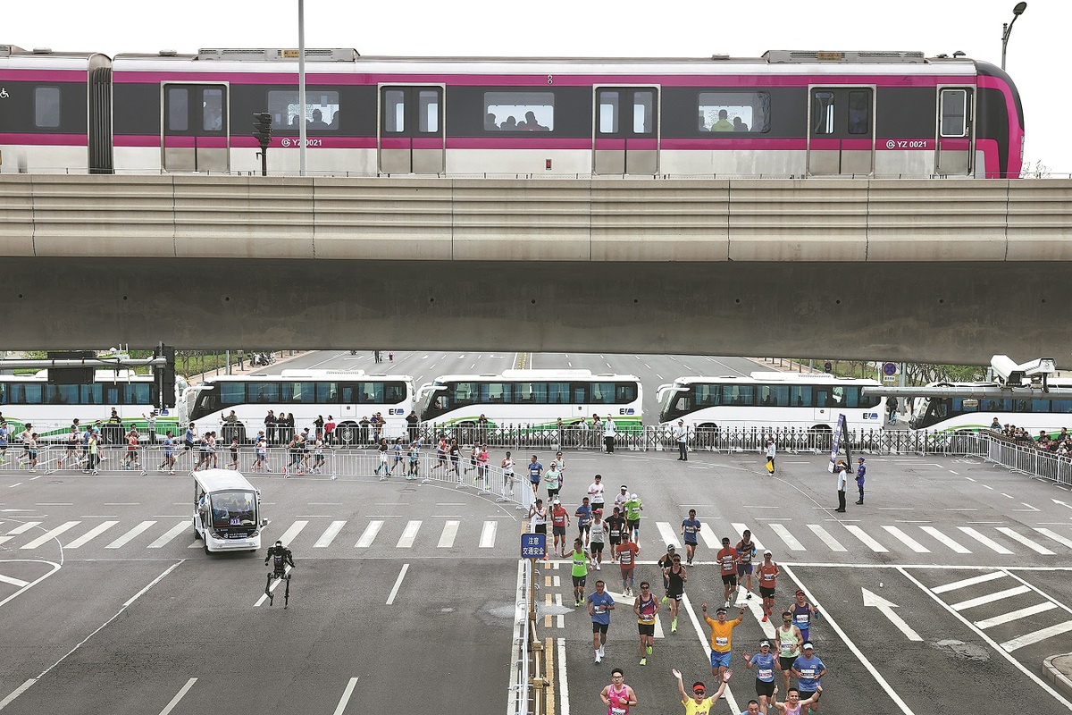Хуманоиден робот заедно с човешки участници бяга по време на полумаратона Beijing E-Town през 2026 г. и полумаратона на хуманоидния робот в Пекин на 19 април. WEI XIAOHAO/CHINA DAILY
