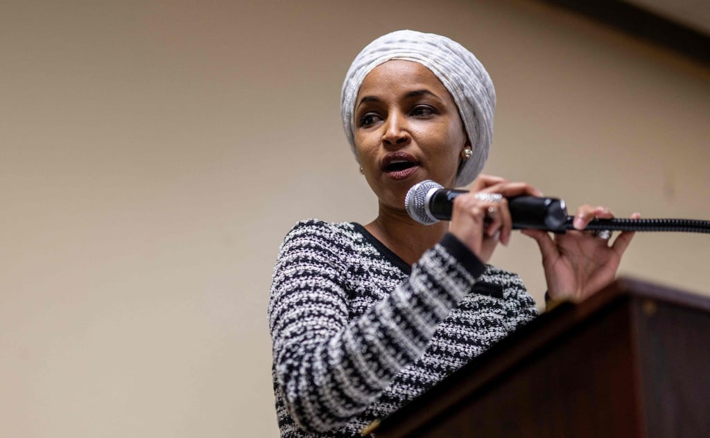 Конгресменът Илхан Омар говори по време на среща на кметството в Минеаполис, Минесота, във вторник. Снимка: AFP