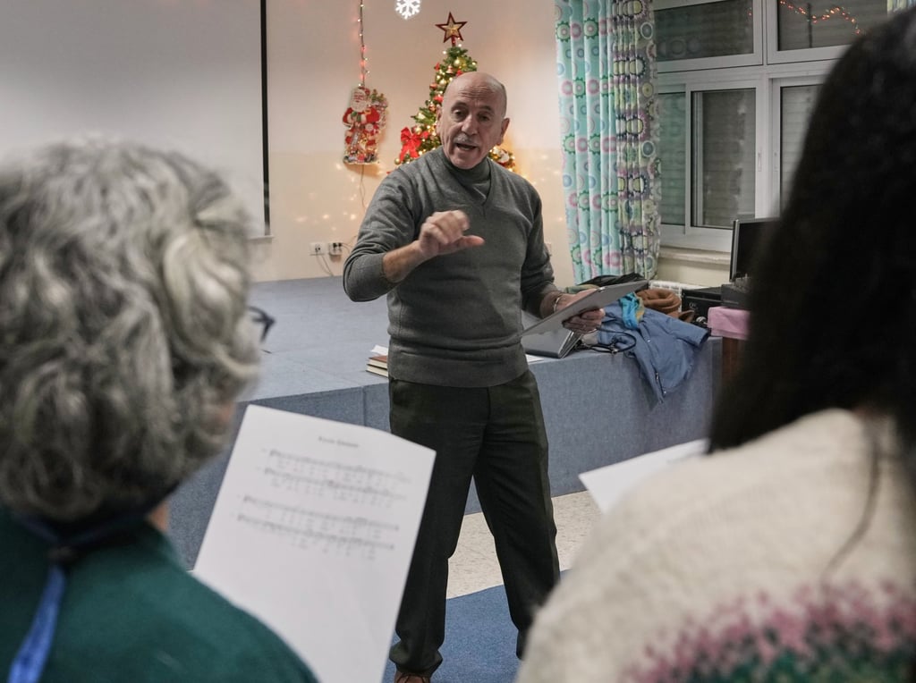 Джоузеф Хазбун ръководи репетиция на хор в църквата „Св. Екатерина“ във Витлеем в петък. Снимка: AP За последните две години, като война в Газа проточена, Коледа в палестински градът беше мрачна афера, без традиционните празници, украси и музика.