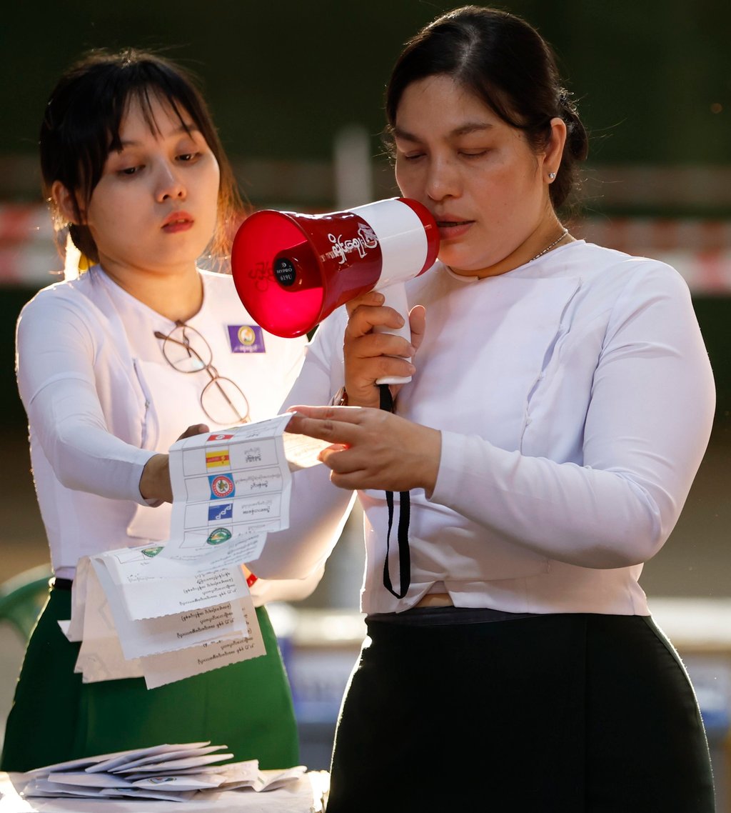 Служител на изборите в Мианмар обявява резултатите в избирателна секция в Янгон в неделя. Снимка: EPA