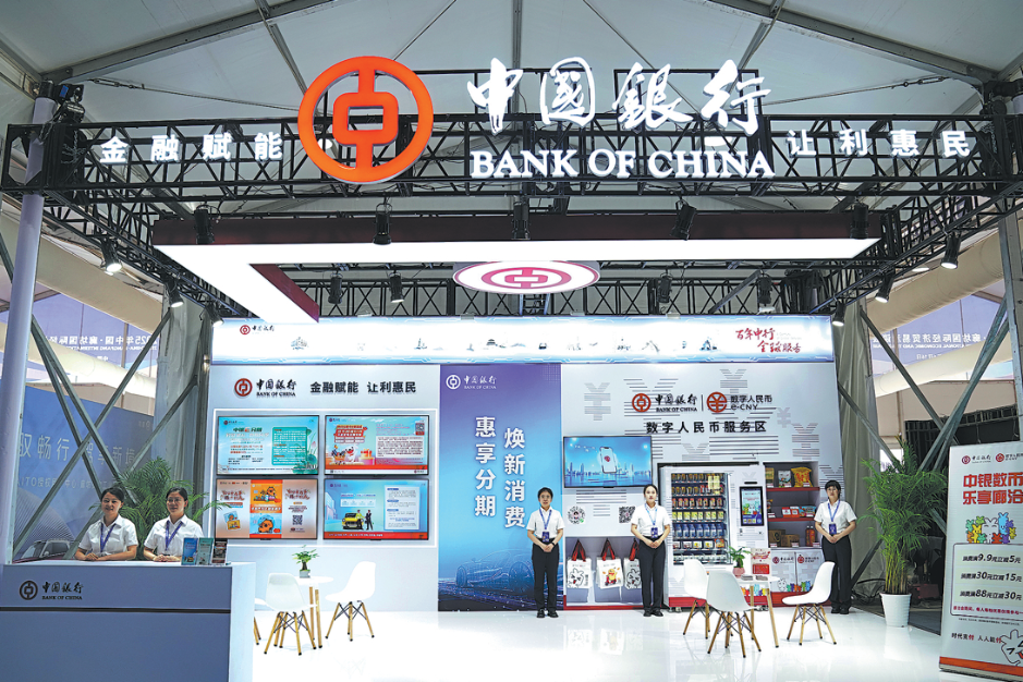 По посока на часовниковата стрелка от върха: Кабинът на Банката на Китай на Международния икономически и търговски панаир на Китай през 2025 г.. Служител на персонала на BOC позира с чуждестранен посетител пред продуктовата зона на банката E-CNY на панаира. Жена се обслужва в Центъра за платежни услуги на BOC в провинция Шанси. [Photos provided to China Daily]